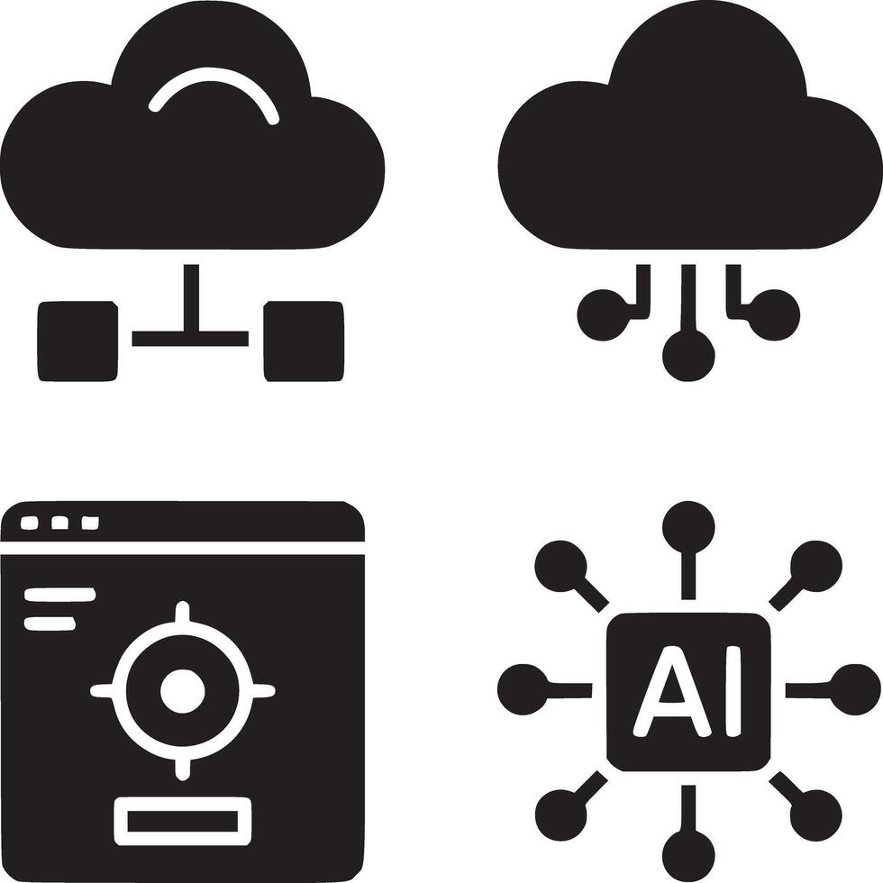 Four black silhouette icons depicting cloud computing ai targeting and data connections on white Pro Vector