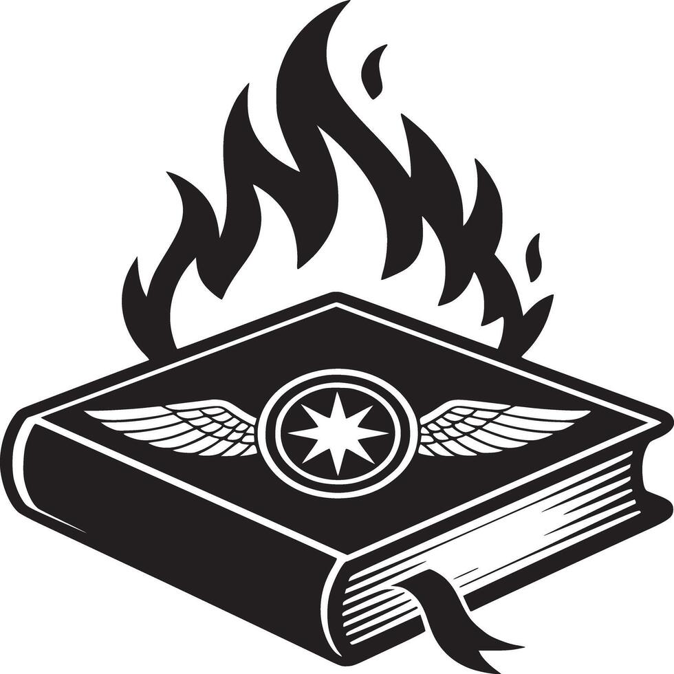 Ignite your imagination with an enchanting book burning with knowledge and mystical winged emblem Pro Vector