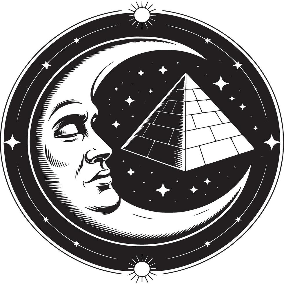 Mystical moon face with ancient pyramid and stars create a powerful symbol for enlightenment and wisdom Pro Vector