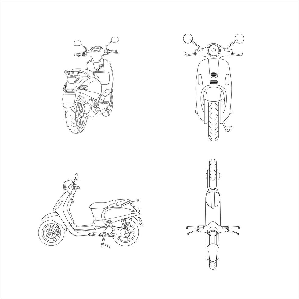 This image presents four precise black and white line art illustrations of a sleek urban scooter, showing distinct views a clear front, a comprehensive side profile, and two unique overhead angles Free Vector