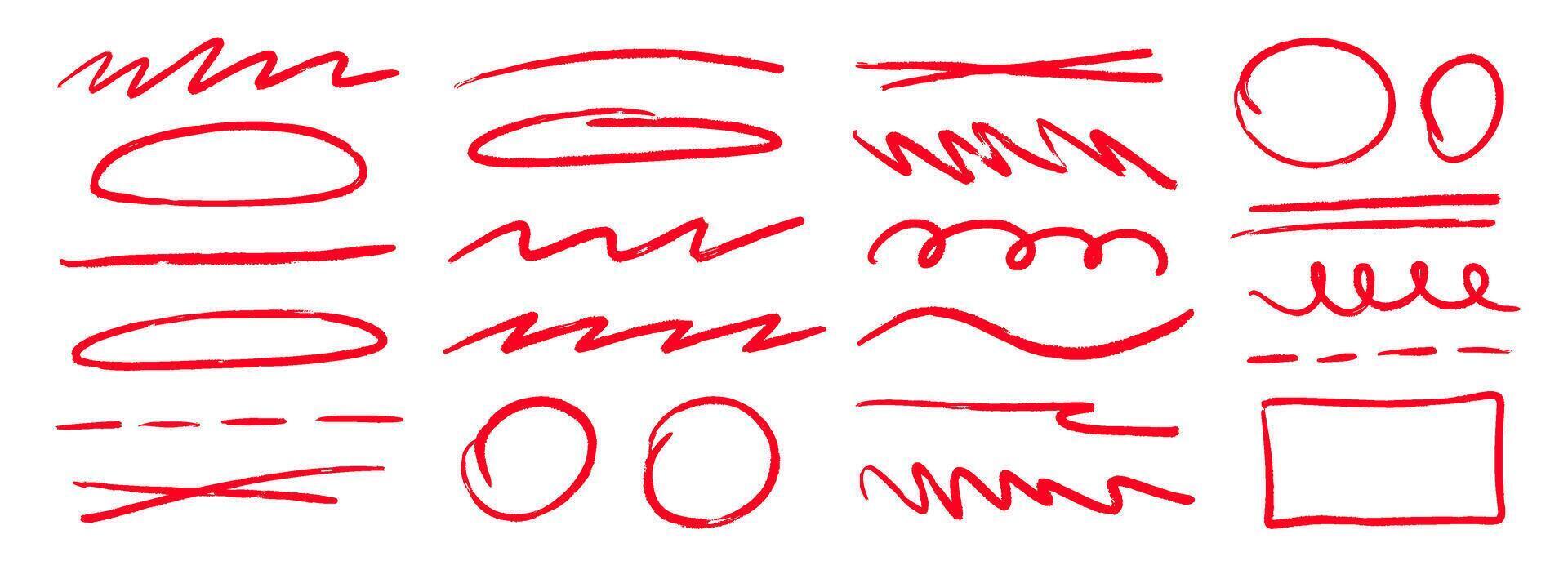 Red hand drawn shapes and lines set. Sketched geometric frames and stripes collection. Zig zag and wavy scribble pack. Marker note signs for mark, emphasis, accent, highlight. Doodled borders Pro Vector