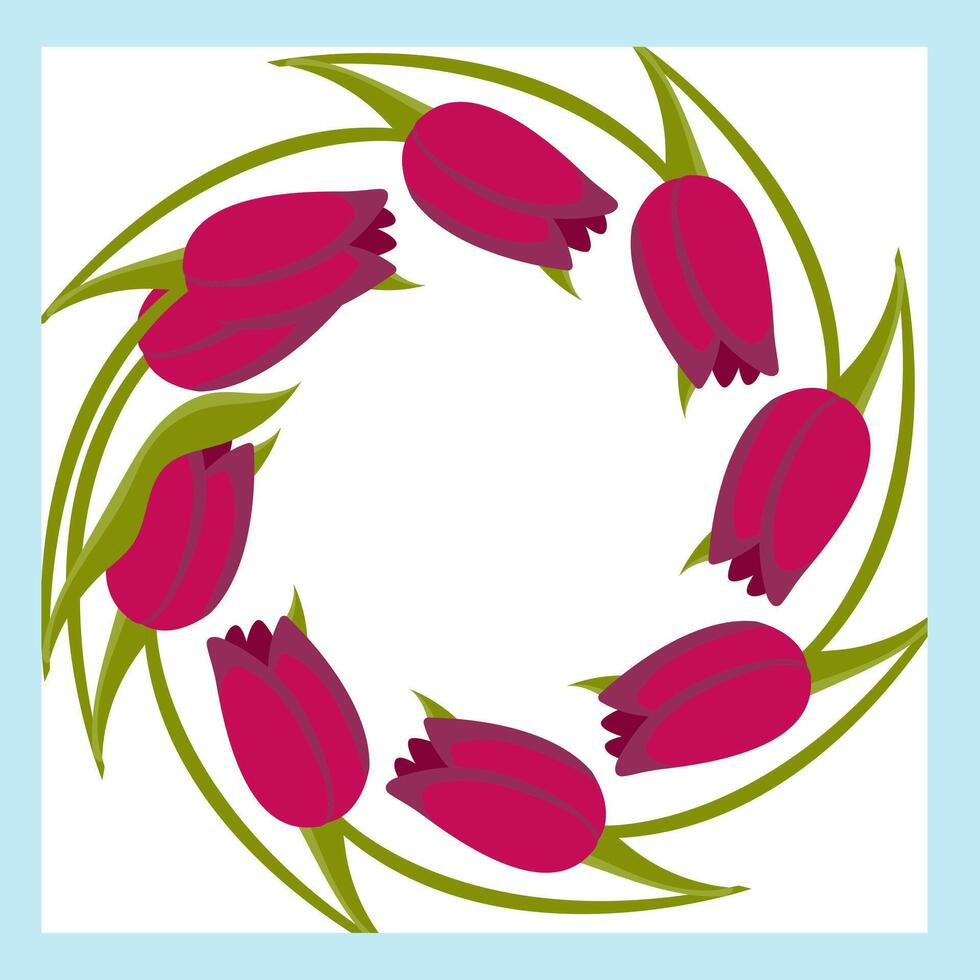 Frame with a circular pattern of red tulips. illustration isolated on a blue background. Pro Vector