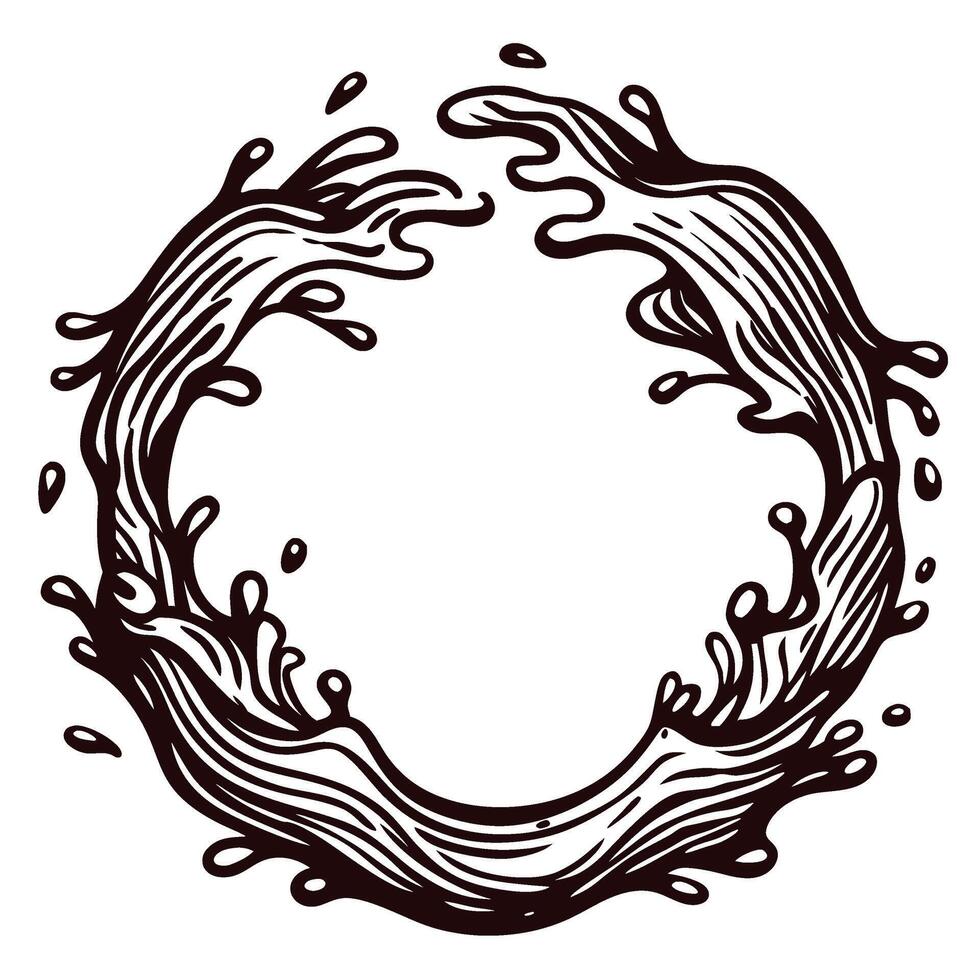 Hand drawn swirling water splash circular frame with flowing waves and droplets isolated on white background Pro Vector
