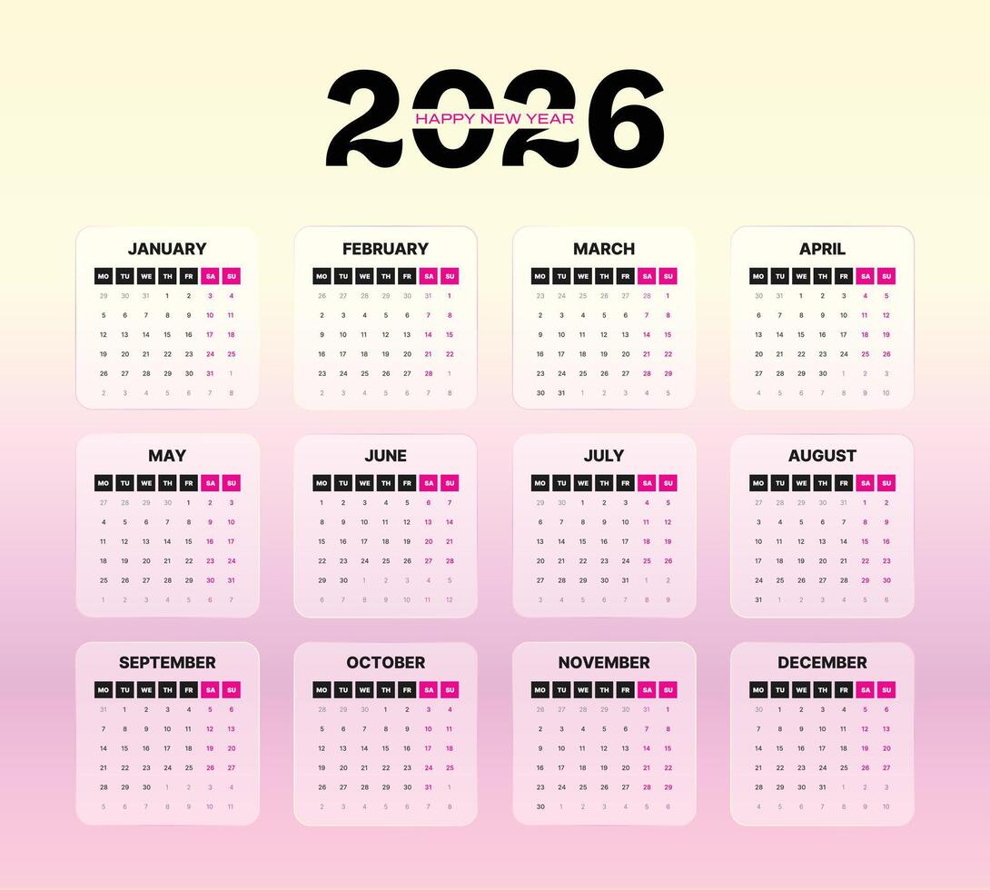 2026 Calendar Template with Gradient Background Modern 12 Months Yearly Planner Design for Print and Digital Use Pro Vector