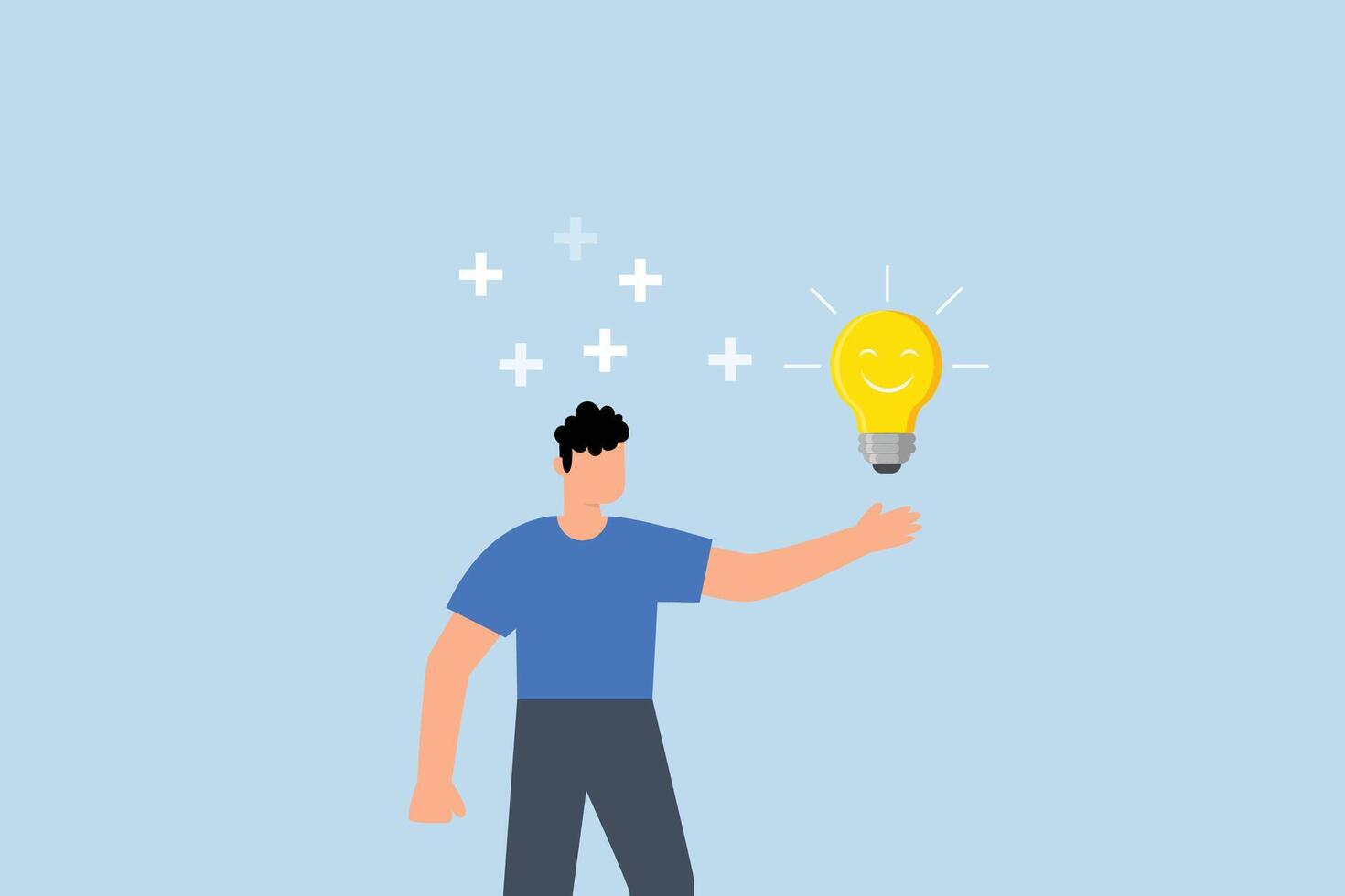 Positive thinking, Smiling businessman holds a lightbulb idea with surrounding positive vibes Pro Vector