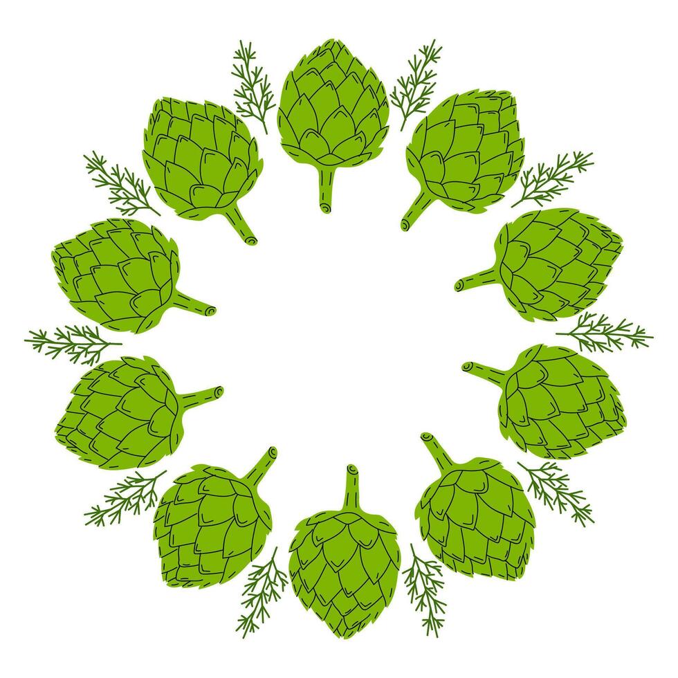 Round frame green artichokes arranged in a circular pattern with herbs on white background Pro Vector