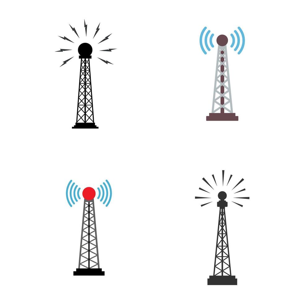 Four icons of communication towers with signal waves and lightning communication tower Pro Vector