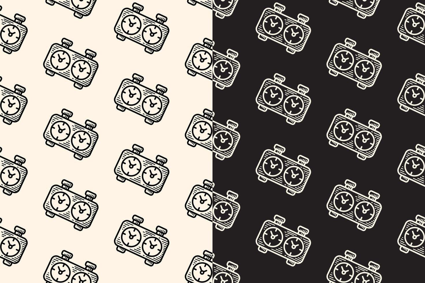 Chess clock engraving seamless pattern on black beige background. Timer chess game hand drawn doodle pattern background. Chess timer figure hatching motif wallpaper. Board game merchandise Pro Vector