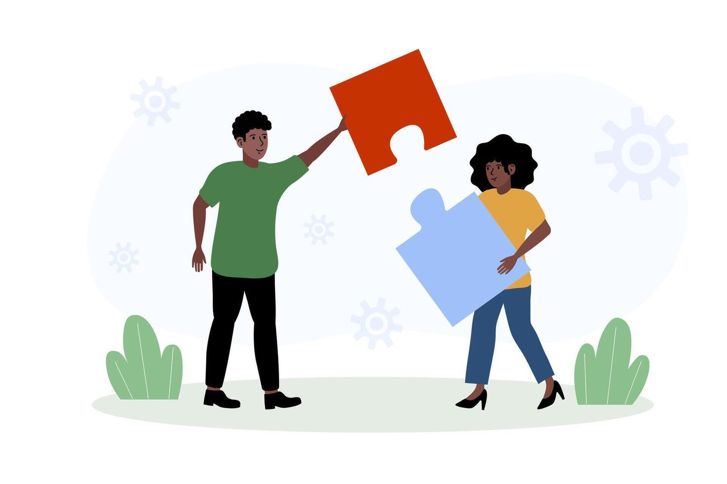 Collaborative teamwork between two individuals with large puzzle pieces in a creative setting Pro Vector
