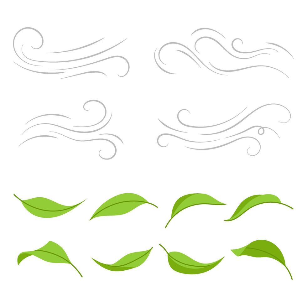 Set of green leaves and wind flow icons on white background. Constructor with natural elements for different design. Pro Vector