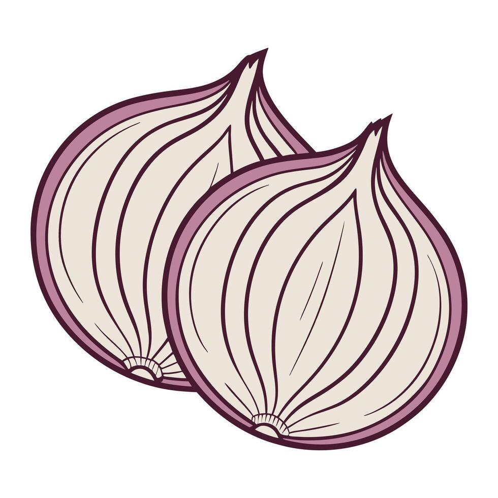 Two halves of a red onion shown in a simple illustration style with visible layers Pro Vector