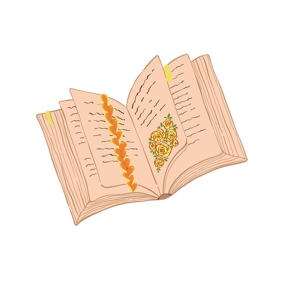 Open book and pages with text, bookmarks separating pages in the book. Education concept. Line drawing. Open book sign. Flying pages. World Book Day Pro Vector