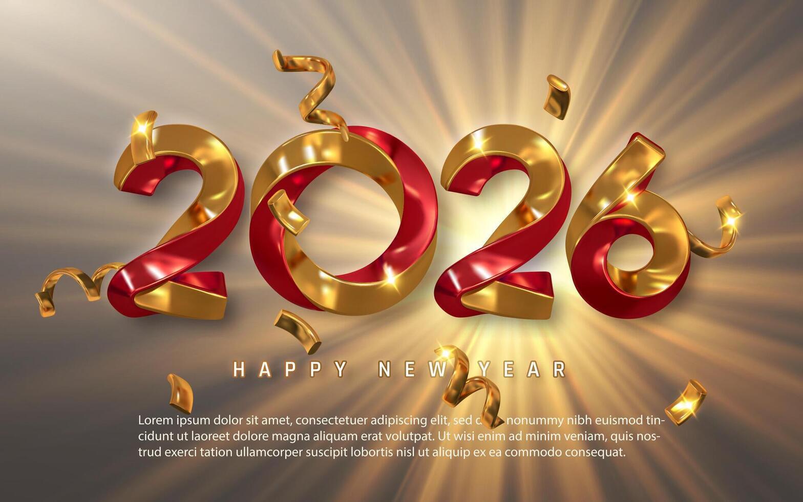 Luxury 2026 New Year Design With Shiny Golden And Red 3D Numbers, Sparkling Confetti, And Light Rays On Elegant Background. Perfect Festive Template. Illustration Pro Vector