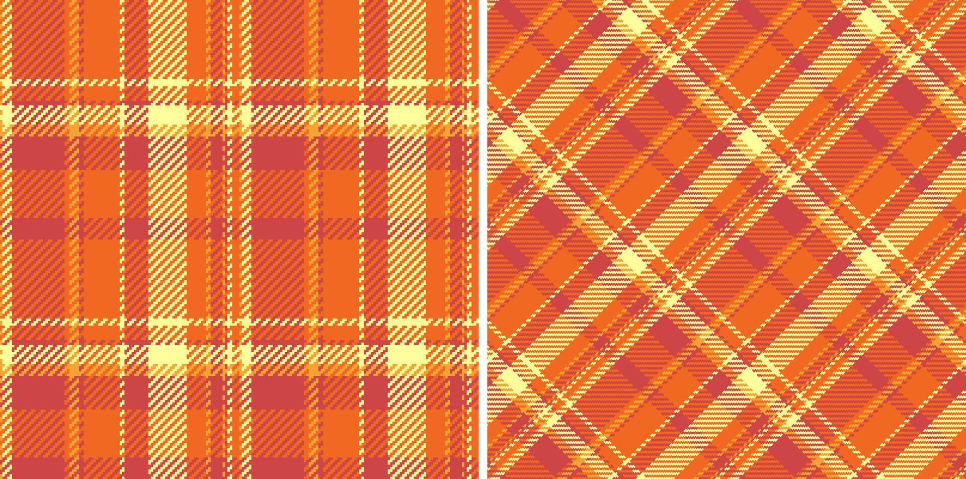 Warm, inviting plaid patterns in orange hues. Seamless and versatile, ideal for textiles, backgrounds, and autumnal designs. Two variations for creative use. Pro Vector