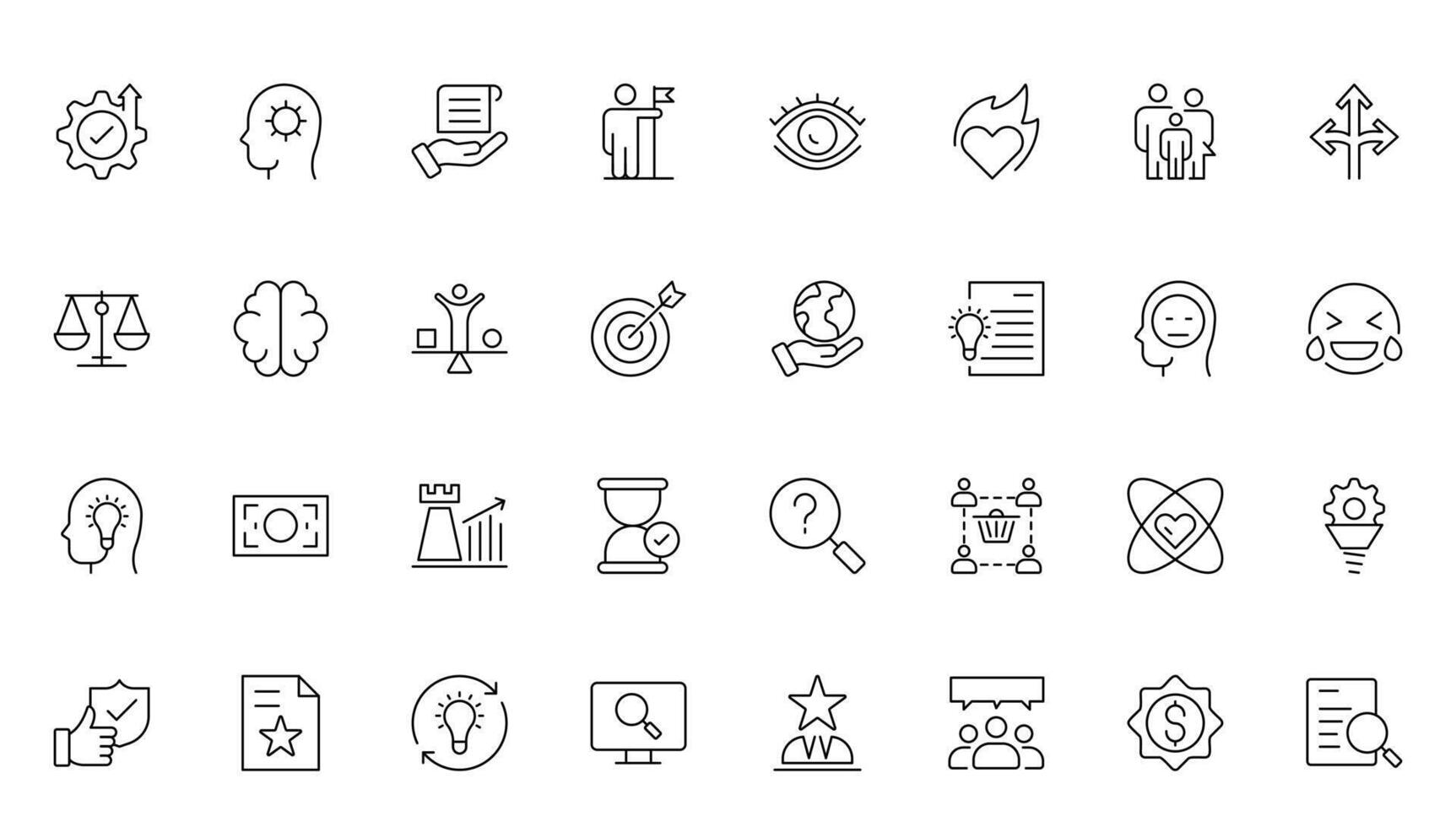 Core Values line icon Pack. Core, values, business, leadership, goals, target, client, quality, success, responsibility and quality. Pro Vector