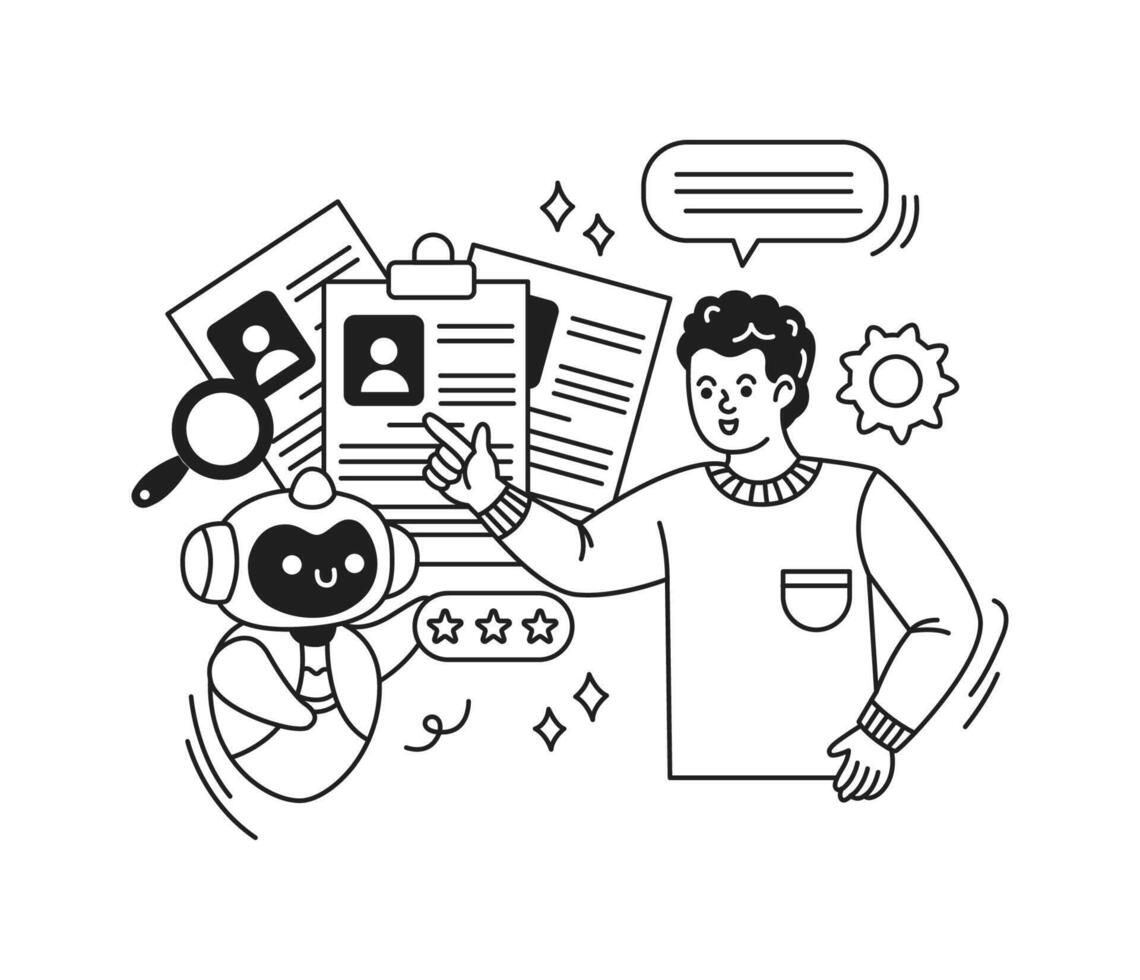 Black and white illustration of a robot and human interacting joyfully. They are assessing documents on a white background. Suitable for technology and teamwork themes. Pro Vector