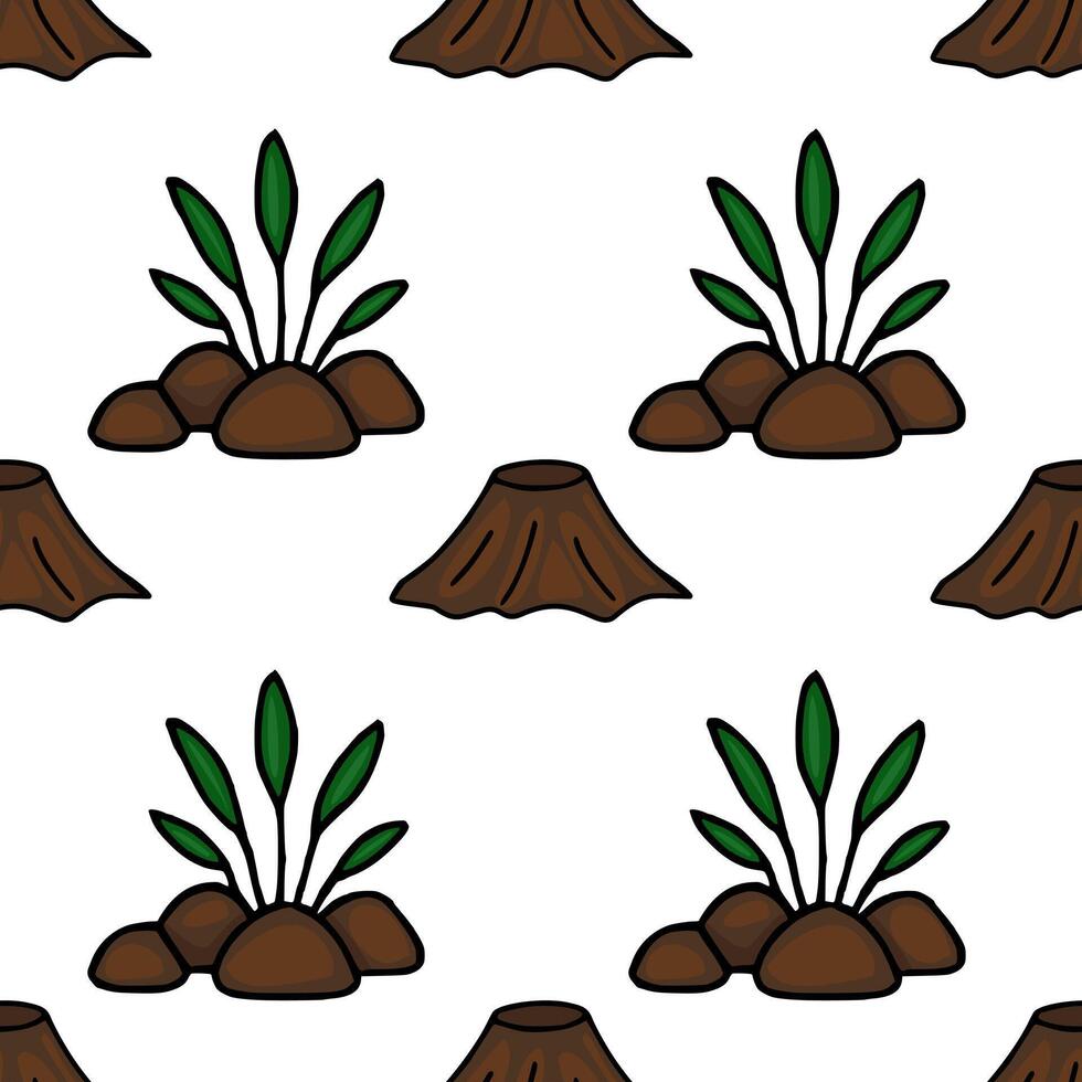Seamless pattern featuring stylized tree stumps and sprouting plants on a white background, creating a playful yet earthy design. Pro Vector