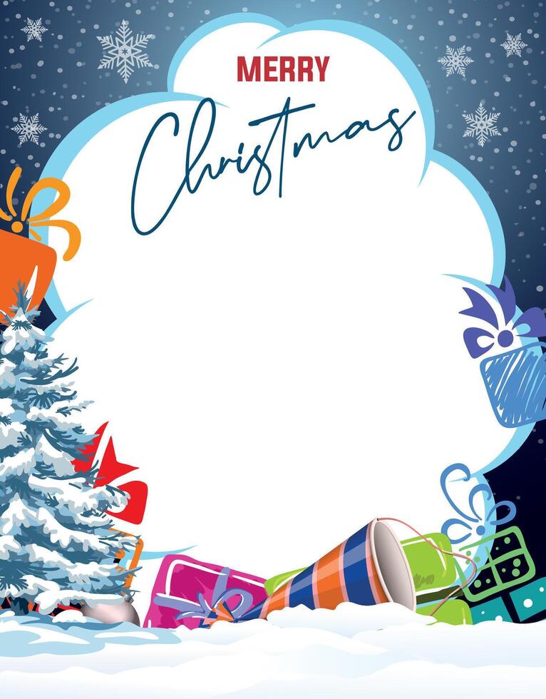 rectangular bright New Year greeting postcard Merry Christmas and Happy New Year on the background of a Christmas tree and snow Pro Vector