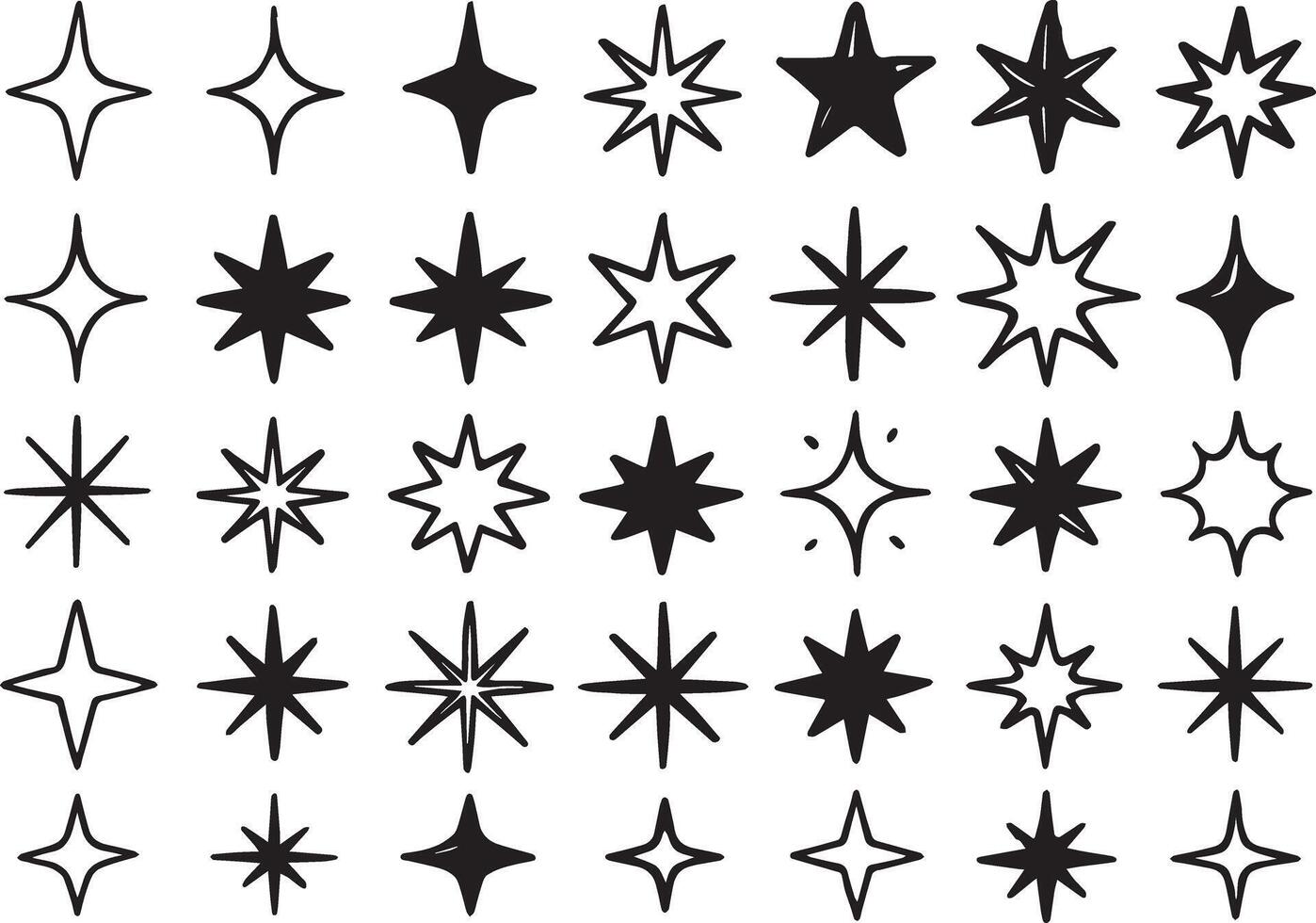 Collection of hand drawn starburst sparkle and shimmer icons in various styles and sizes Pro Vector