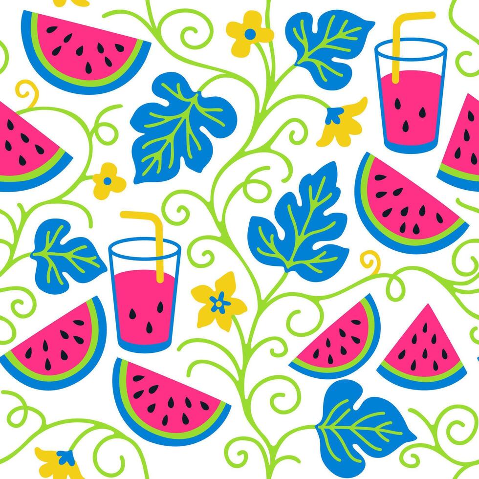 Seamless background for packaging design, wrapping, etc. Bright watermelon slices with seeds, twisted branches and leaves. Pro Vector