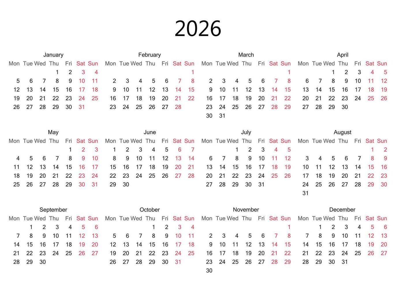 Year 2026 Calendar Layout With Days Highlighted for Easy Reference. Pro Vector