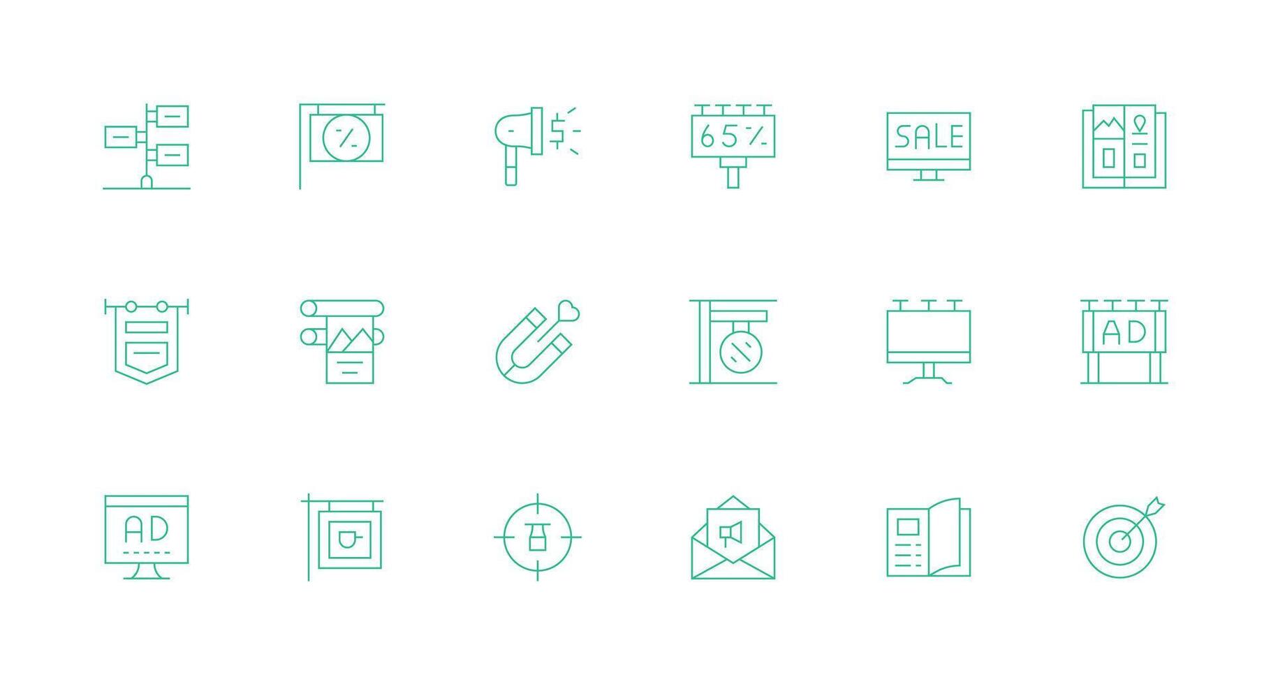 Advertising Design Icons featuring 18 in Minimal Line Style Neatly Designed Icons for Web Platforms Free Vector