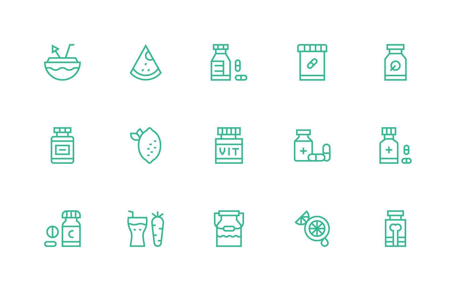 Regular Line Style Vitamin Icons with 15 Vectors Complete Icon Bundle for Web Design