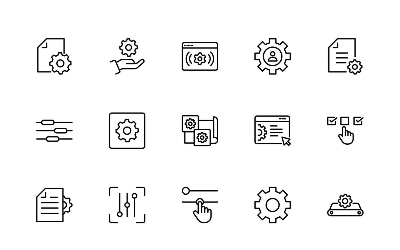 Settings and gear icon set. Containing options, configuration, preferences, adjustments, operation, control panel, optimization and productivity. Pro Vector