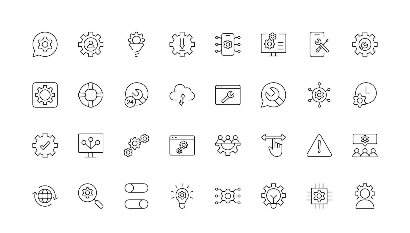 Settings and Gear thin line icon set. options, configuration, preferences, adjustments, operation, gear, control panel, equalizer, management, optimization and productivity icon set. Pro Vector