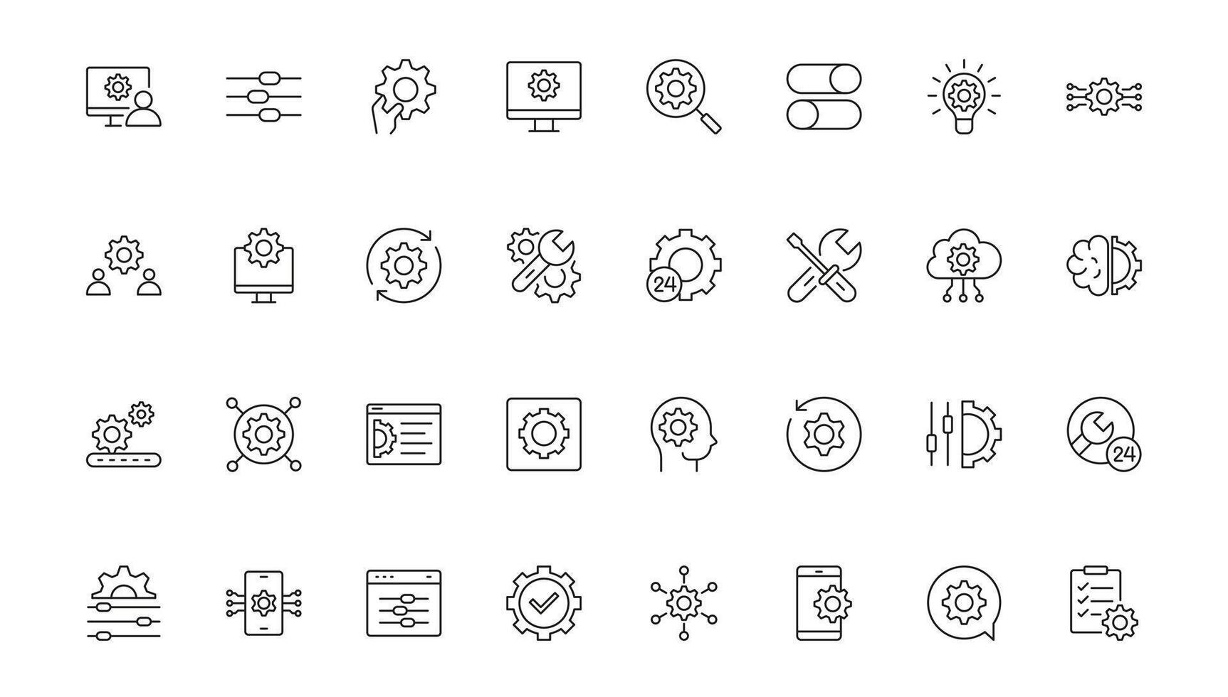 Settings and gear icon set. options, configuration, preferences, operation, control, management, optimization and productivity icon Pack. Pro Vector
