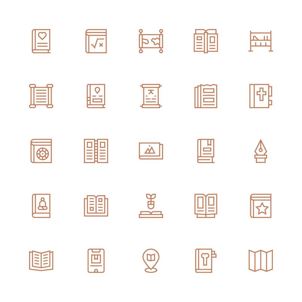 Book Icon Set with 25 Medium Stroke Outline Graphics Customizable Icon Series for Mobile Screens Free Vector