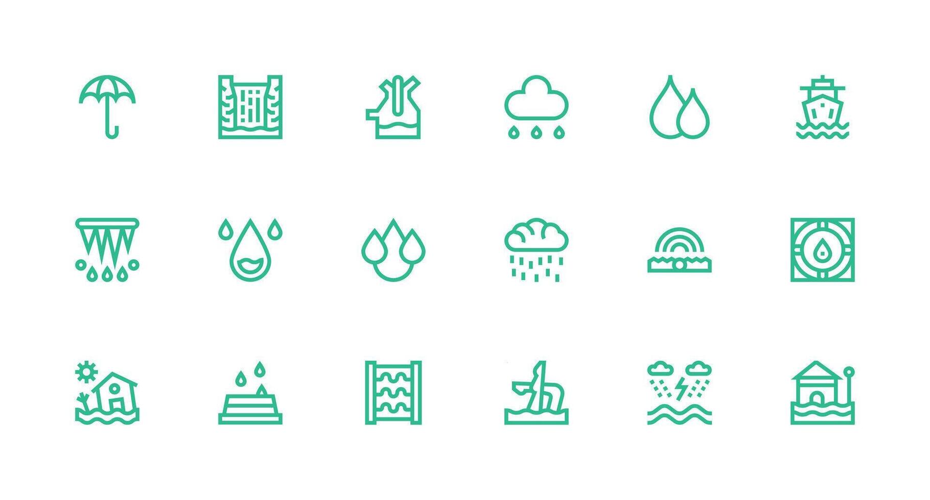 Flood Design Icons featuring 18 in Strong Stroke Line Style Complete Icon Set for Mobile Apps vector