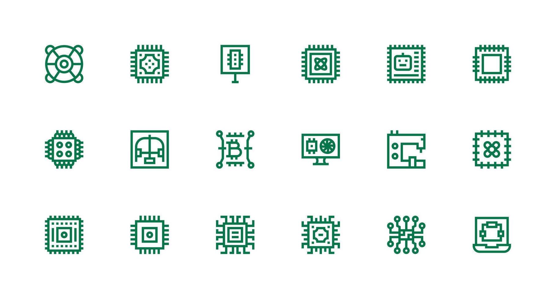 Processor Design Icons featuring 18 in Strong Stroke Line Style Compact Icon Set Free Vector