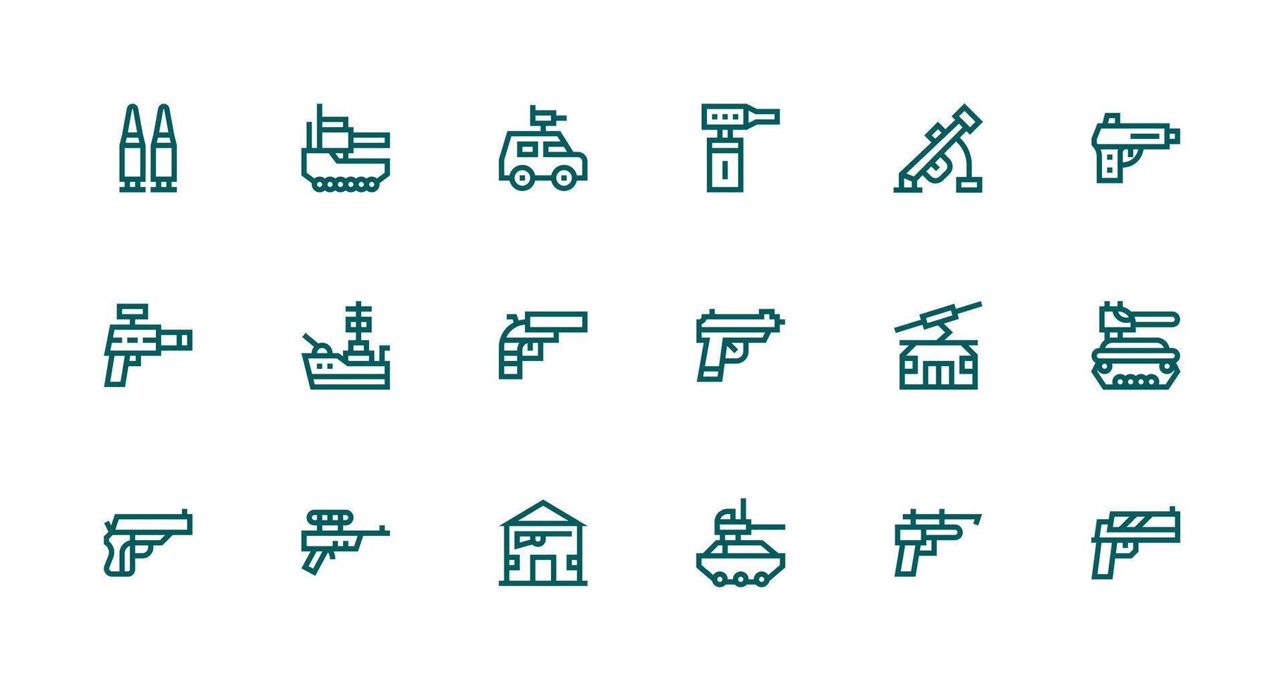 Gun Design Icons featuring 18 in Strong Stroke Line Style Web and App Icon Pack Collection Free Vector