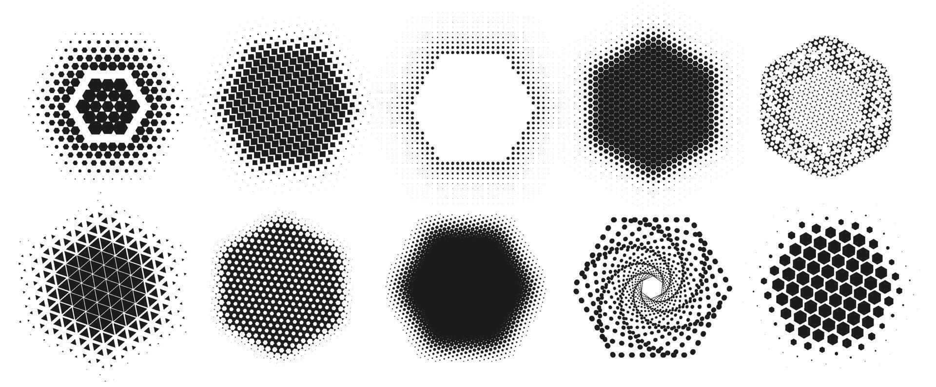 Halftone hexagon shapes. Abstract geometric hexagon dotted patterns with half tone effect, honeycomb texture, spiral design and digital gradient fade structure set Pro Vector