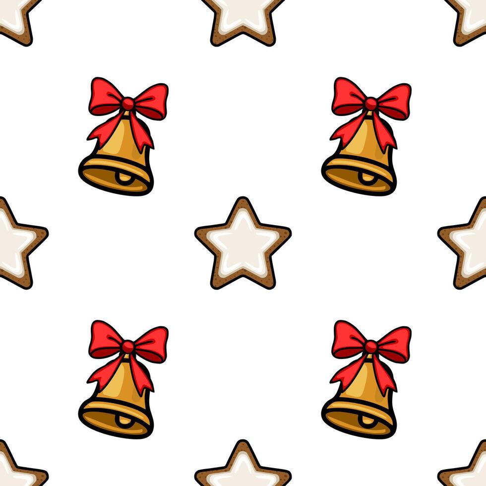 Seamless pattern featuring charming golden bells with red bows and star shaped gingerbread cookies, creating a festive and joyful Christmas design. Pro Vector