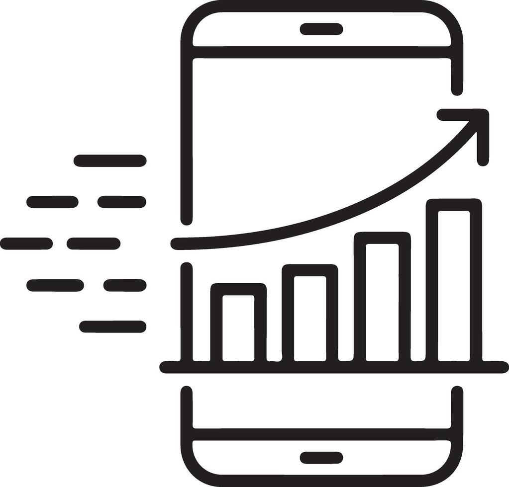 Mobile phone displaying a rising bar graph with an upward trend arrow and speed lines Pro Vector