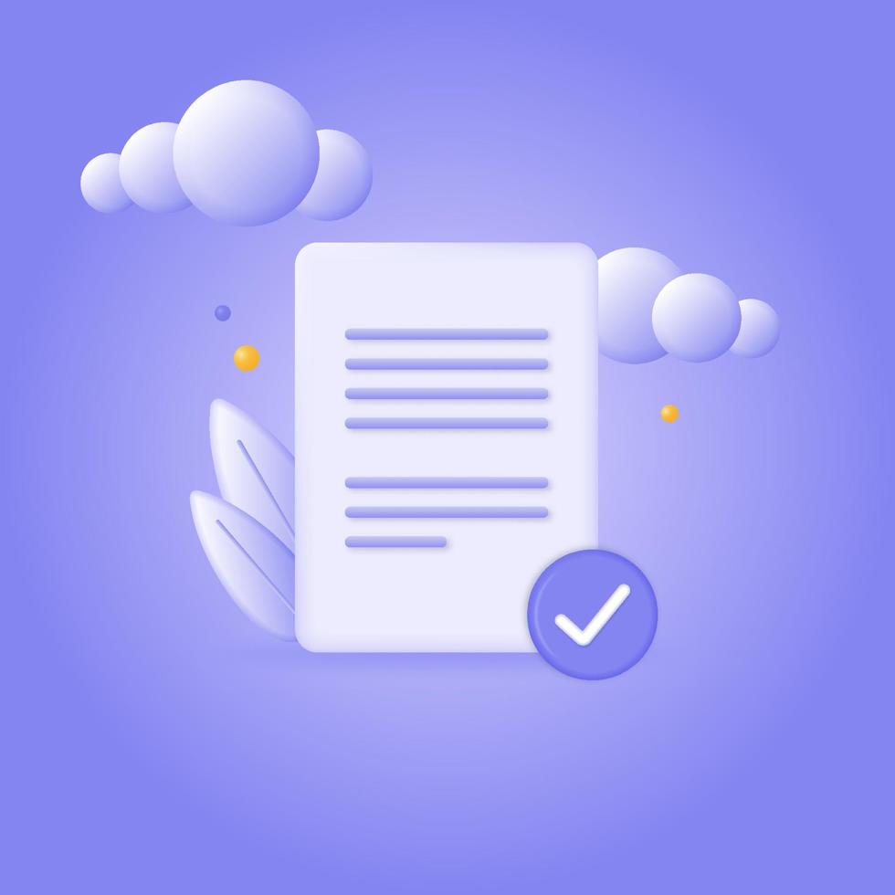 3d icon of paper documents with a check mark. Confirmed or approved document. Business icon. Pro Vector