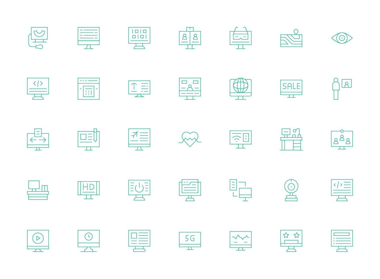 Monitor Design Icons featuring 35 in Light Line Style Scalable Icons for Cross-Platform Interfaces Free Vector