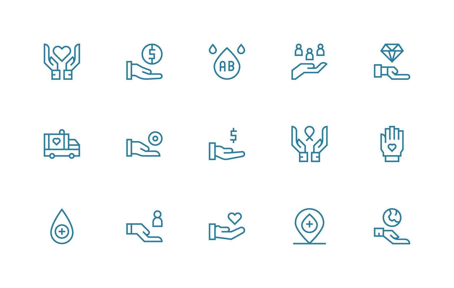 Donation Set with 15 Regular Line Icons Complete Icon Bundle for Web Design vector