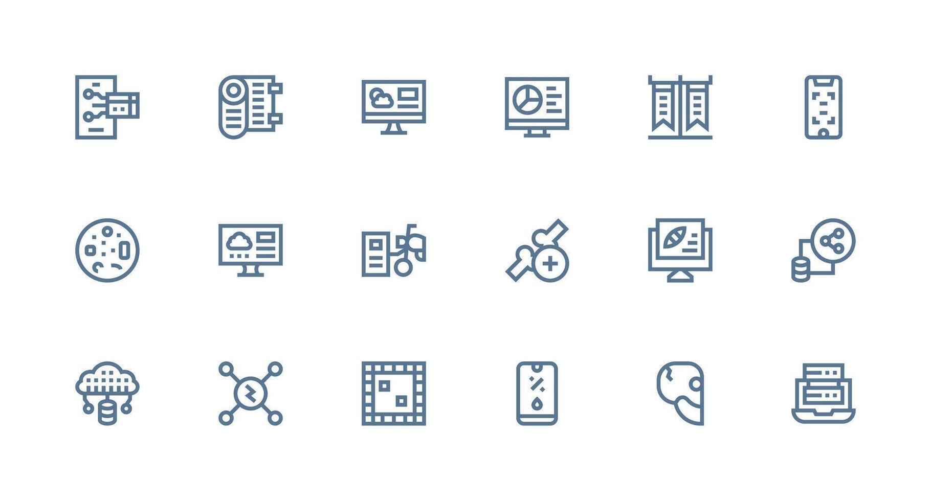 Digital Data Design Icons featuring 18 in Strong Stroke Line Style Display Icon Pack Free Vector