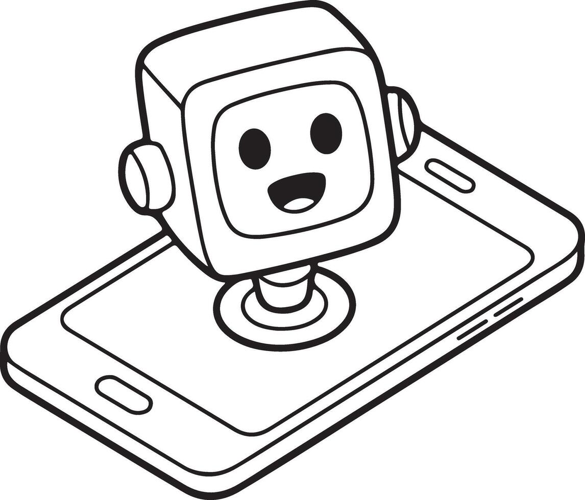 Cute cartoon robot character emerging from a modern smartphone screen with a friendly expression Pro Vector