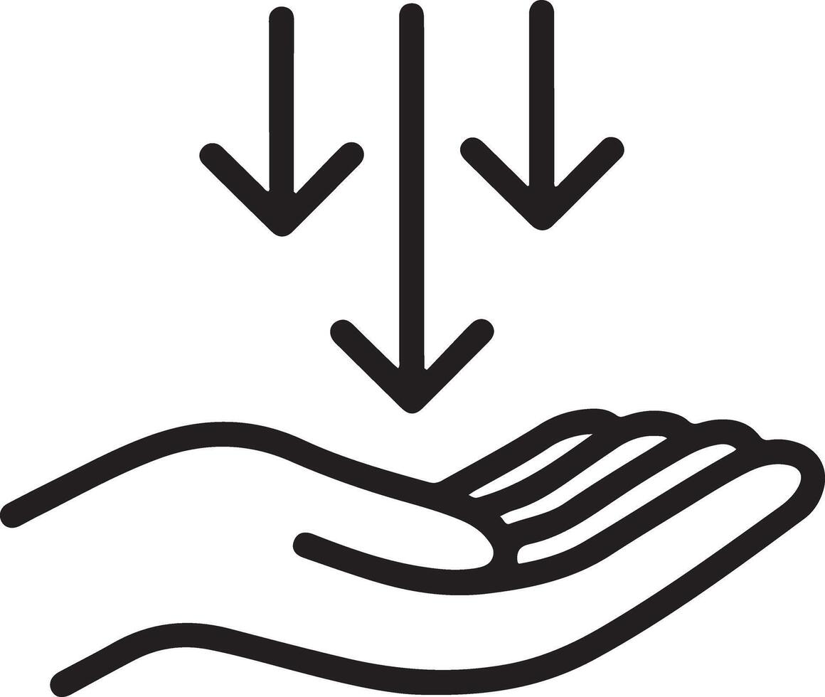 Simple line art icon of three downward arrows pointing towards an open palm Pro Vector