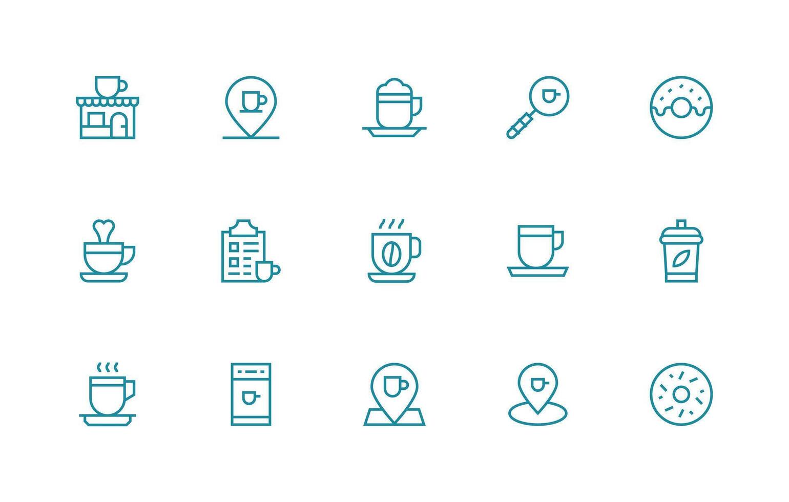 Coffee Shop Design Icons featuring 15 in Regular Line Style Fully Editable Icon Set for Web vector