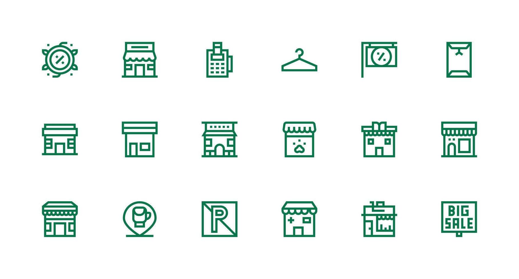 Retail Store Design Icons featuring 18 in Strong Stroke Line Style Customizable Icon Series for Mobile Screens Free Vector