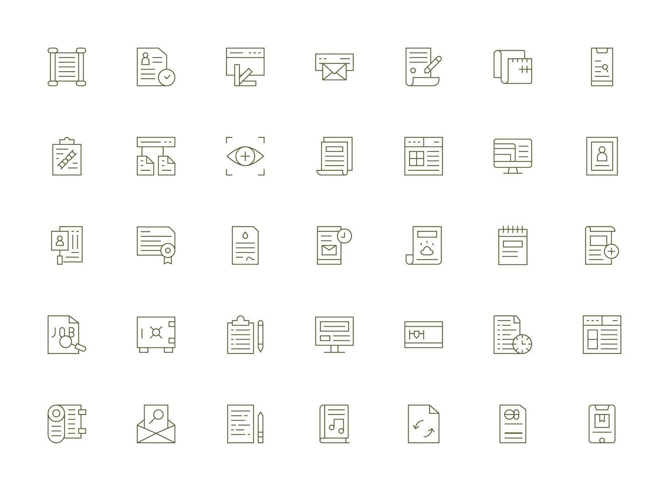 Document Icon Set with 35 Light Line Graphics Organized Pack for Project Assets Free Vector
