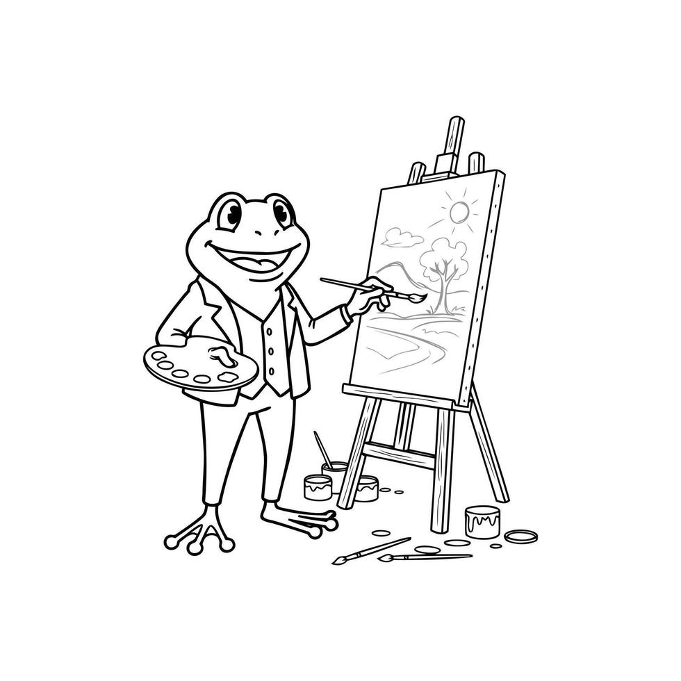 An anthropomorphic frog painter creating artwork on an easel. Line art illustration showing creativity and an artistic hobby. Pro Vector