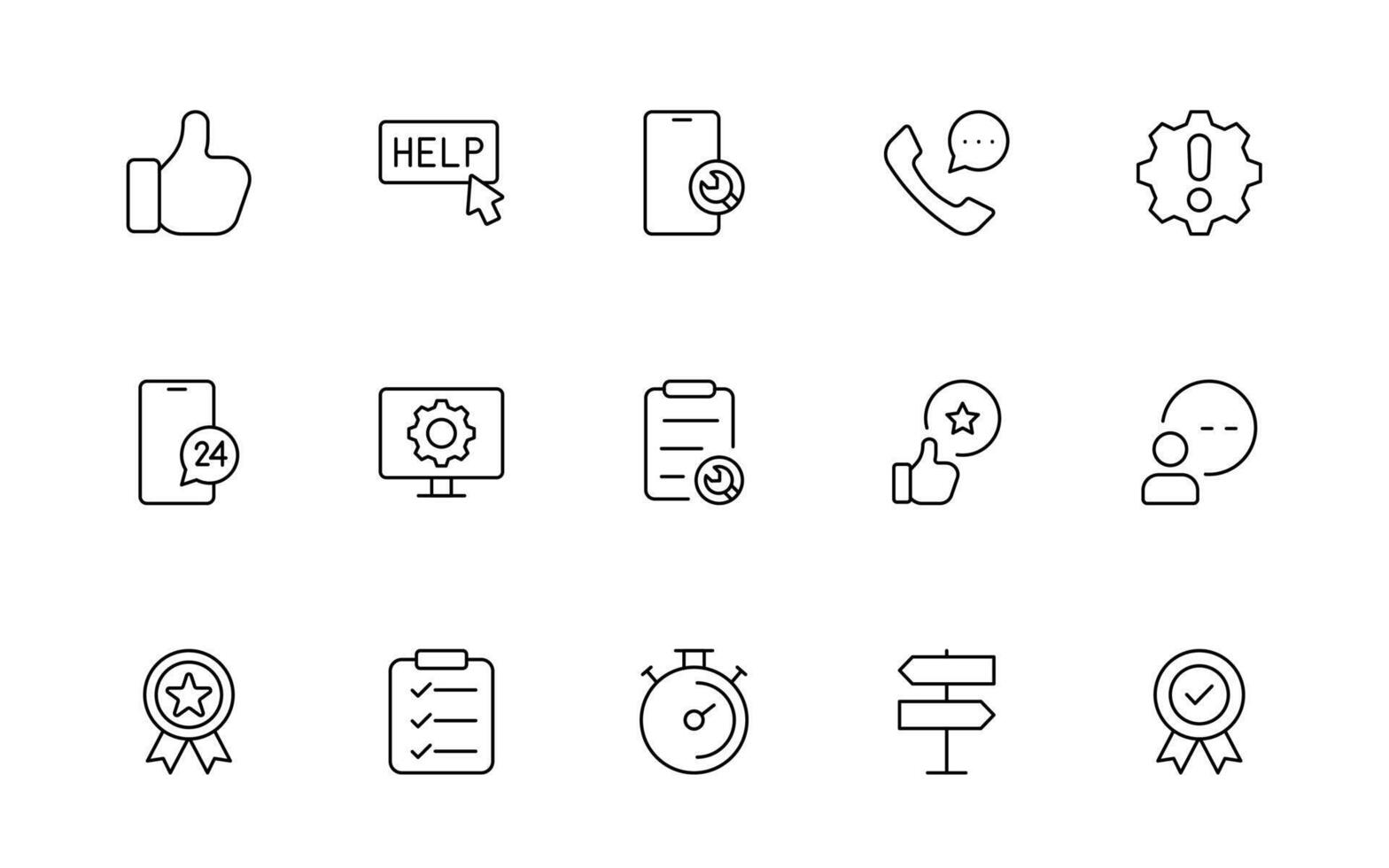 Support and customer service icons. Customer Feedback, Response, experience, helpline and technical support minimal editable thin line icon collection. Pro Vector