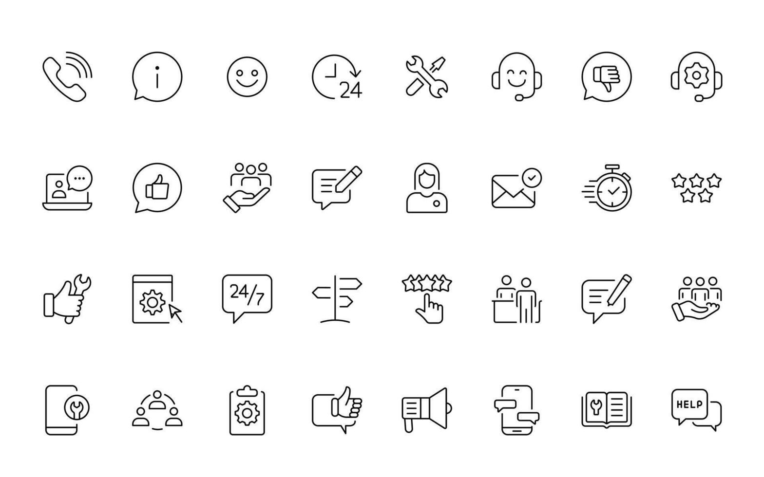 Support and customer or client service style modern icons set. Customer Feedback, Response, experience, helpline and technical support simple minimal thin line icons. Pro Vector