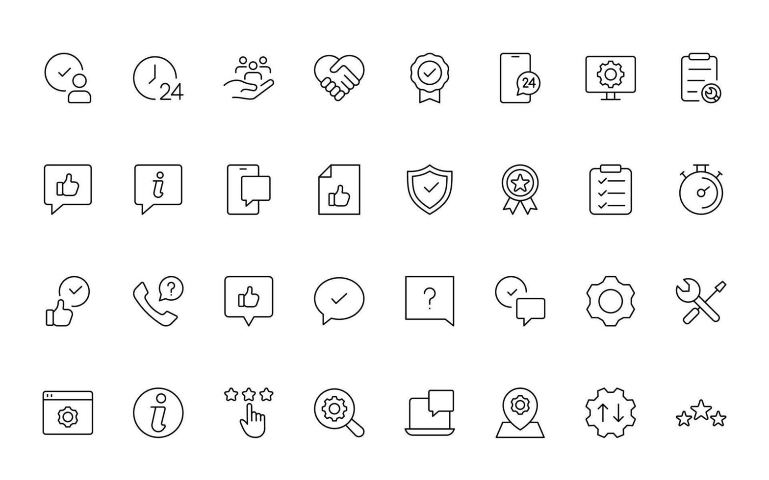 Support and customer service icons. Customer Feedback, Response, experience, helpline and technical support simple minimal thin line icon collection. Pro Vector